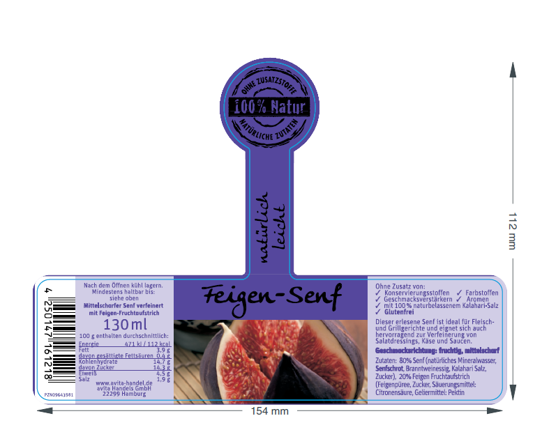 Zutaten: Senf (80 %), Feigen-Fruchtaufstrich (Feigenpüree, Zucker, Citronensäure, Pektin)