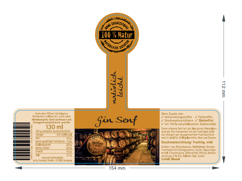 Zutaten: Senf, Orangenfruchtaufstrich (Orangenpüree, Zucker, Citronensäure, Pektin), Branntweinessig, 5 % Gin, Kalahari-Salz