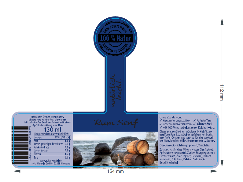 Zutaten: natürliches Mineralwasser, Senfschrot, Apfelzubereitung (Apfel, Zucker, Säuerungsmittel: Citronensäure, Zimt, Ingwer, Gewürze), Branntweinessig, 5 % Rum, Kalahari-Salz, Zucker