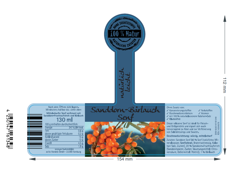 Zutaten: Senf, Sanddorn-Fruchtaufstrich (Sanddornpüree, Zucker, Citronensäure, Pektin), Bärlauch