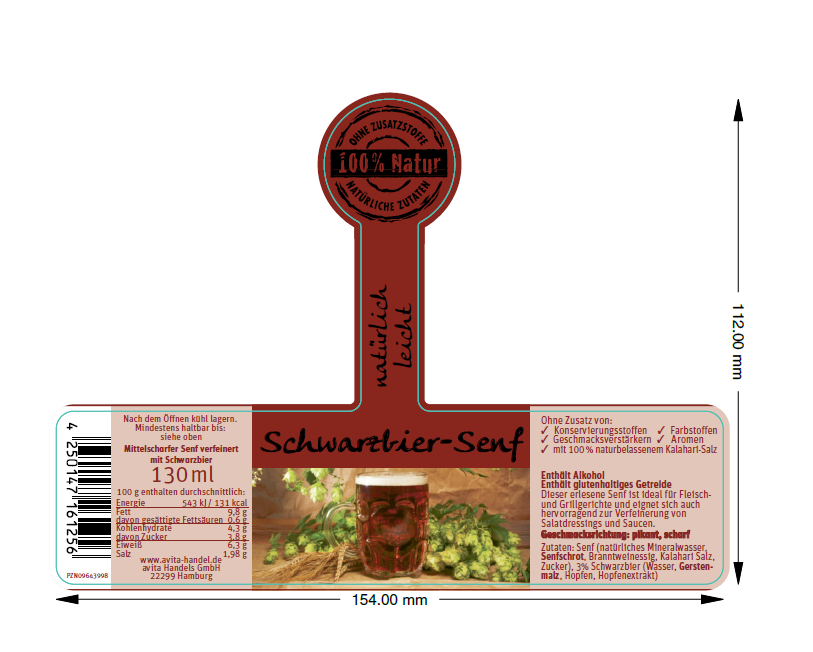 Zutaten: Senf, Schwarzbier, Branntweinessig, Kalahari-Salz, Zucker