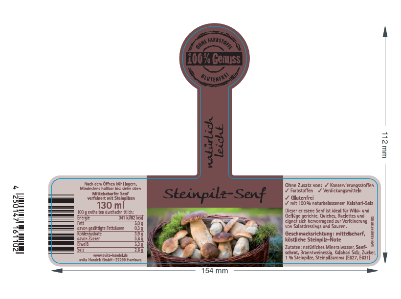 Zutaten: Senf, Steinpilze, Branntweinessig, Kalahari-Salz, Zucker