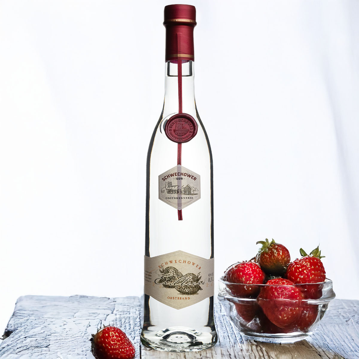 Obstbrand ERDBEERE 0.5l (40%Vol) - Unser Schwechower Obstbrand Erdbeere konserviert den wunderbar süßen Geschmack des Sommers in der Flasche. Er vereint die Vorzüge unseres sonnenreichen Bundeslandes Mecklenburg-Vorpommern mit der Fruchtkompetenz, die uns im Blut liegt.