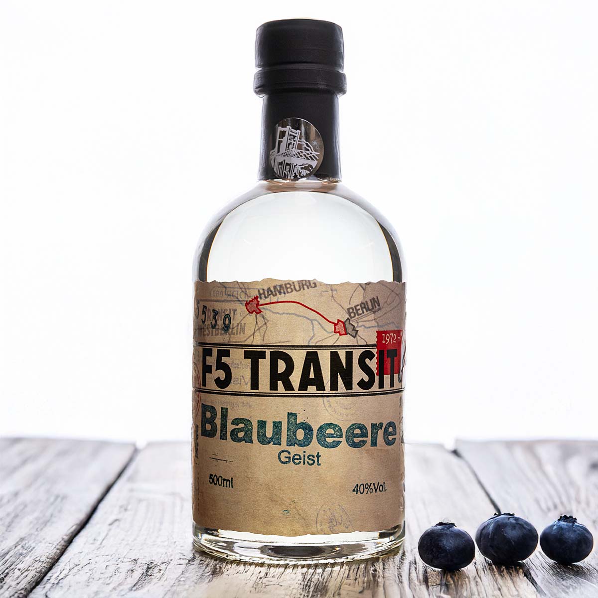 Blaubeere Geist 0.5l (40%Vol) No.5339 - Der Blaubeergeist No. 5339 von F5 Transit ist ein hochwertiger Obstgeist mit intensivem Geschmack nach handverlesenen Blaubeeren. Sorgfältig destilliert, überzeugt er durch seine klare Struktur und den weichen Abgang.