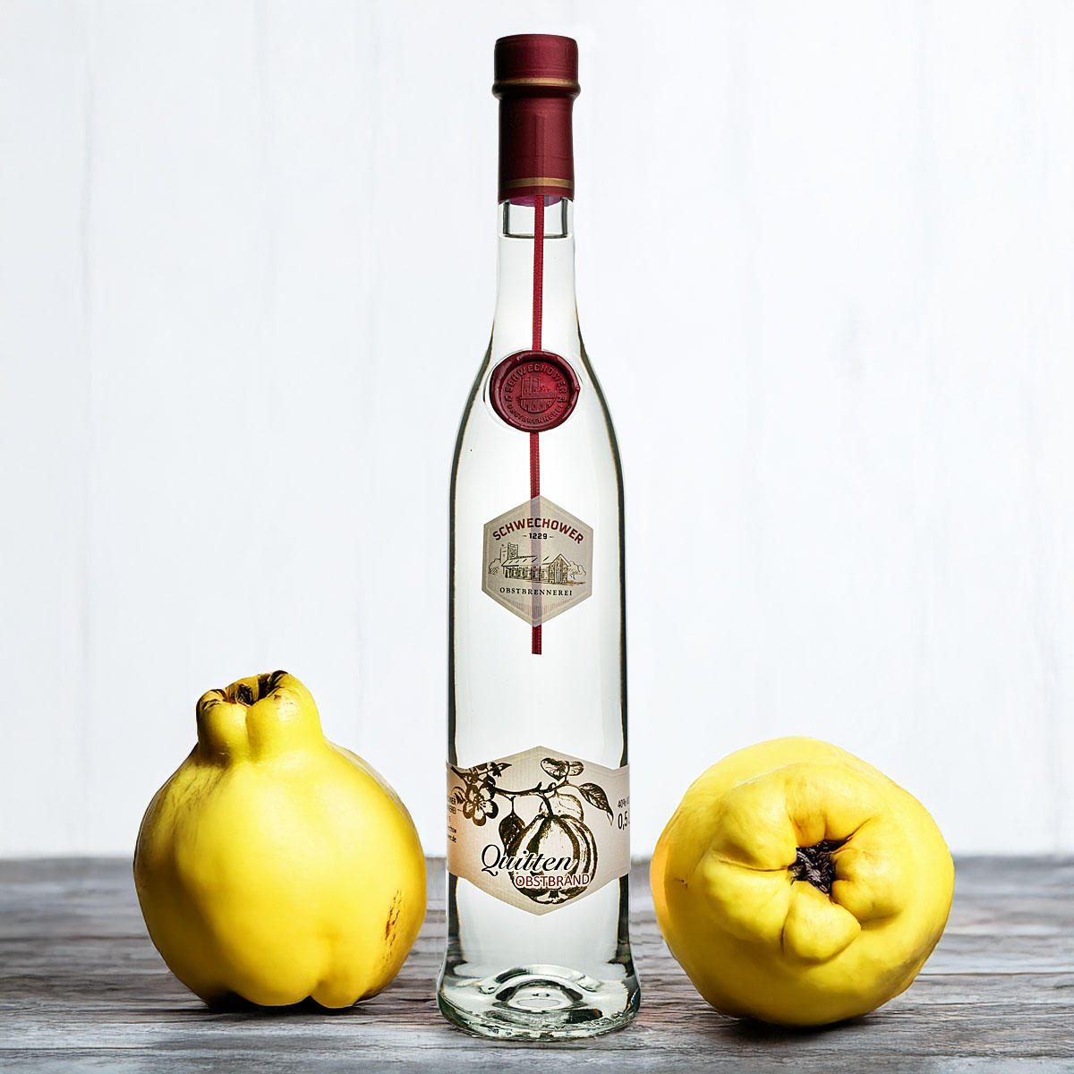 Dieser Obstbrand wird aus edlen Quitten voller Reife hergestellt. Die Quitte wird vor allem von Liebhabern sehr geschätzt. Das Reifestadium der Frucht ist besonders gut an der Ausfärbung und der Flaumschicht zu erkennen: Färbt sich die Schale goldgelb und verliert ihren Flaum, ist es Zeit für die Ernte. Je nach Sorte ist es meist Anfang bis Mitte Oktober soweit.